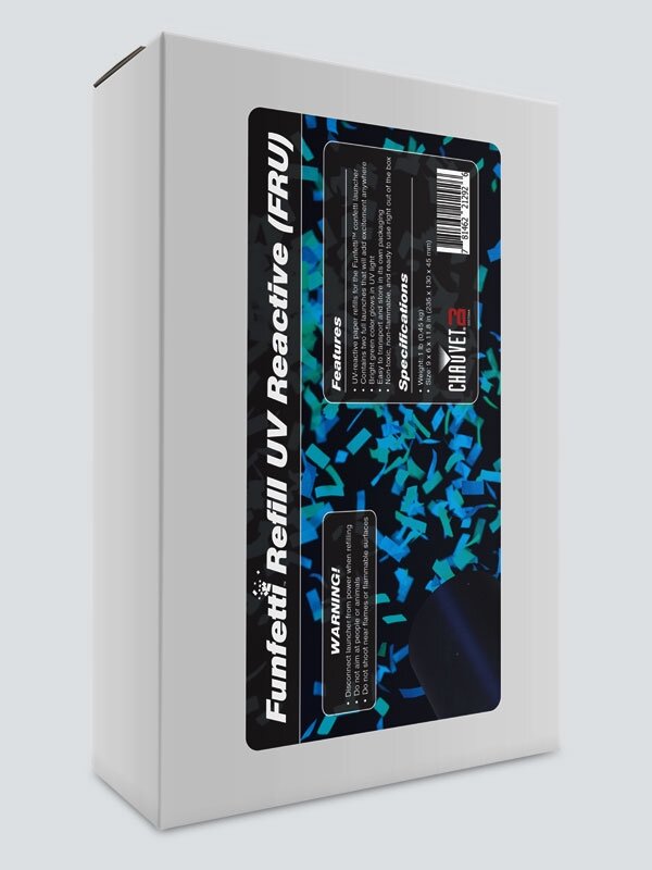 Le FRU est une recharge de confettis qui réagit grâce aux UV non toxiques et non inflammables. Il peut être stocké et transportable facilement dans son emballage d’origine.